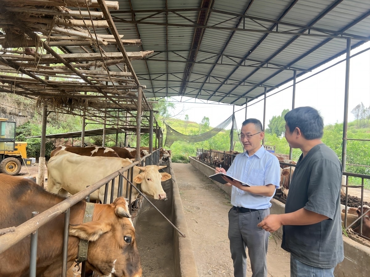 邮储银行资中县支行客户经理走访陈千友的肉牛养殖场。