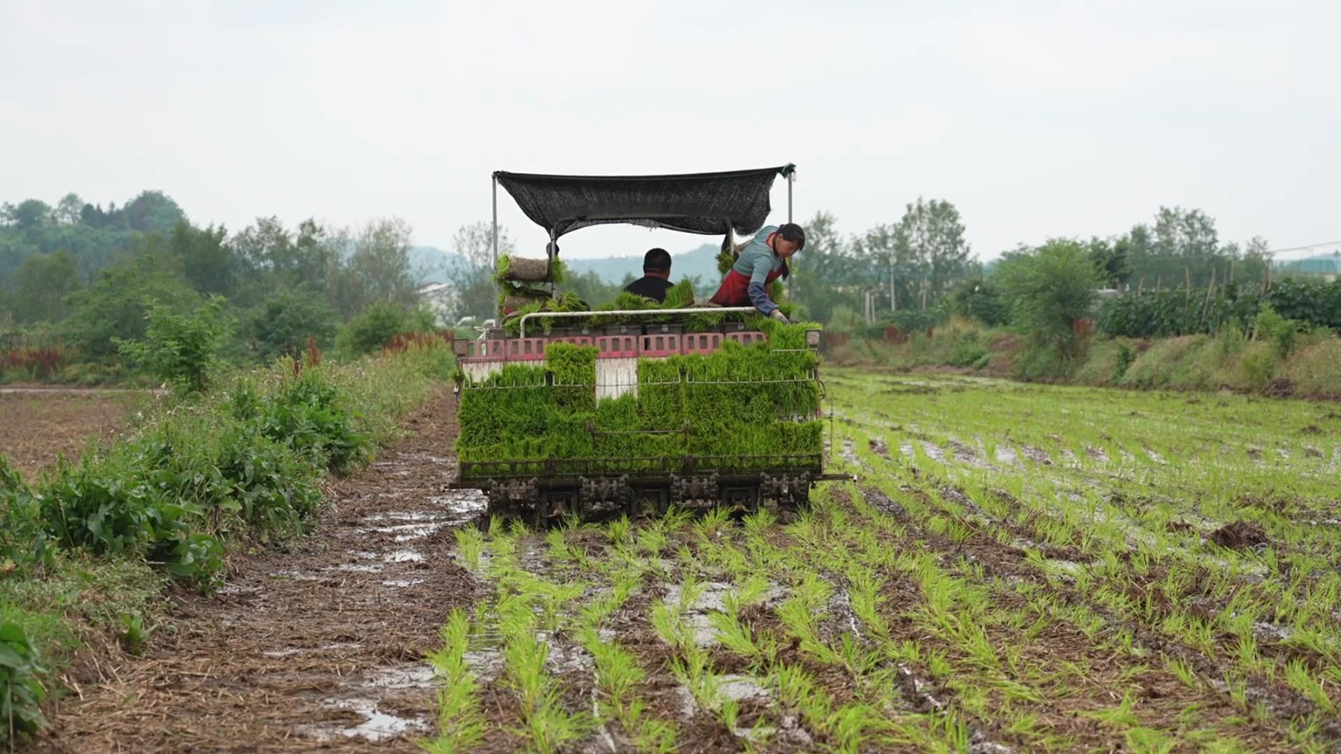 6月5日,在绵阳市梓潼县文昌镇红排村的水稻田里,农机手娴熟地驾驶着插秧机往来穿梭作业。村民们搬运肥料上农机,将青翠的秧苗有序摆放在机台上,随着插秧机向前行进,一株株秧苗从苗盘上依次滑落、插入田中,秧苗整齐挺立,生机盎然。