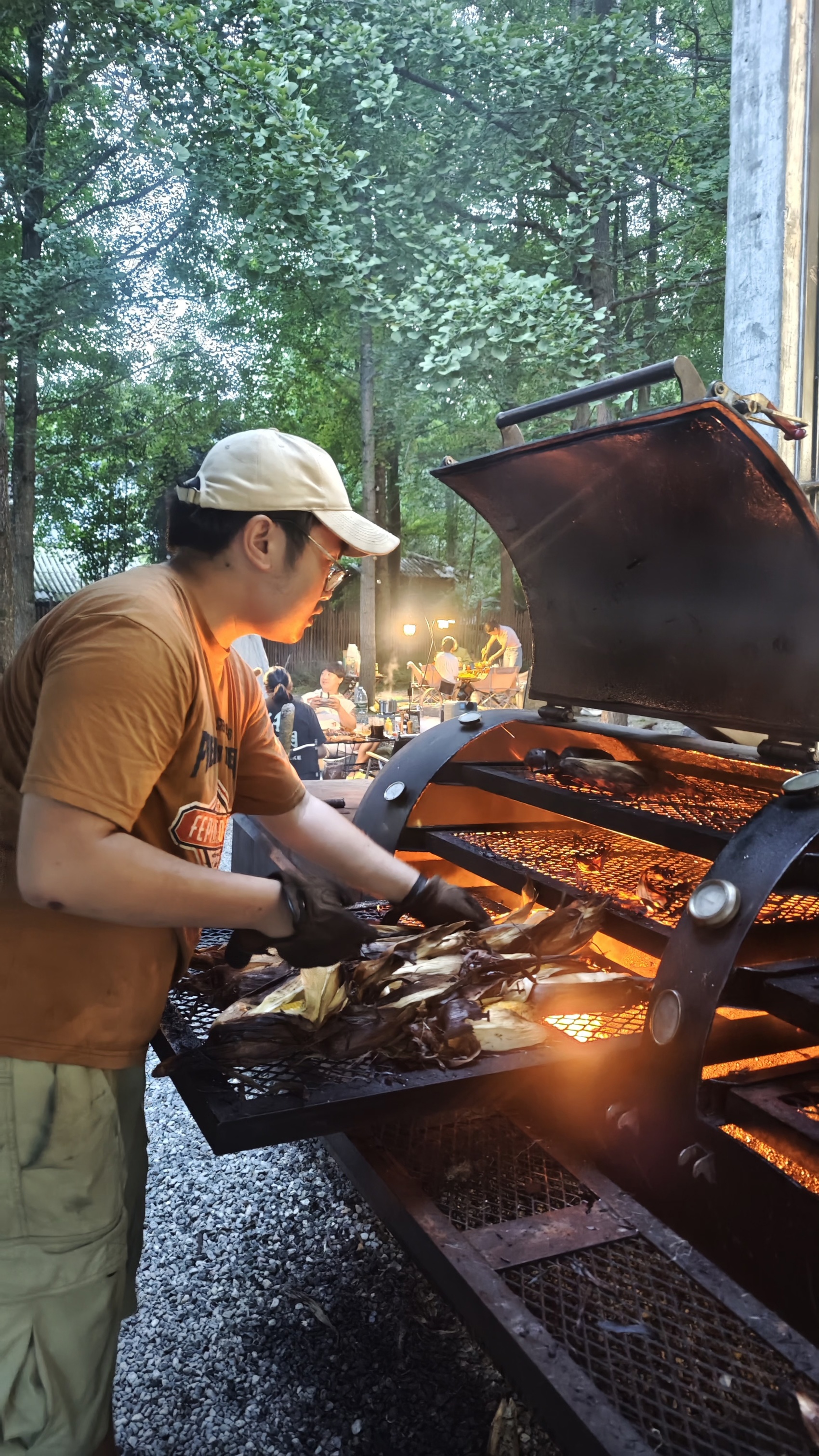 青年在双溪烤房德萨BBQ进行烟熏果木慢烤。