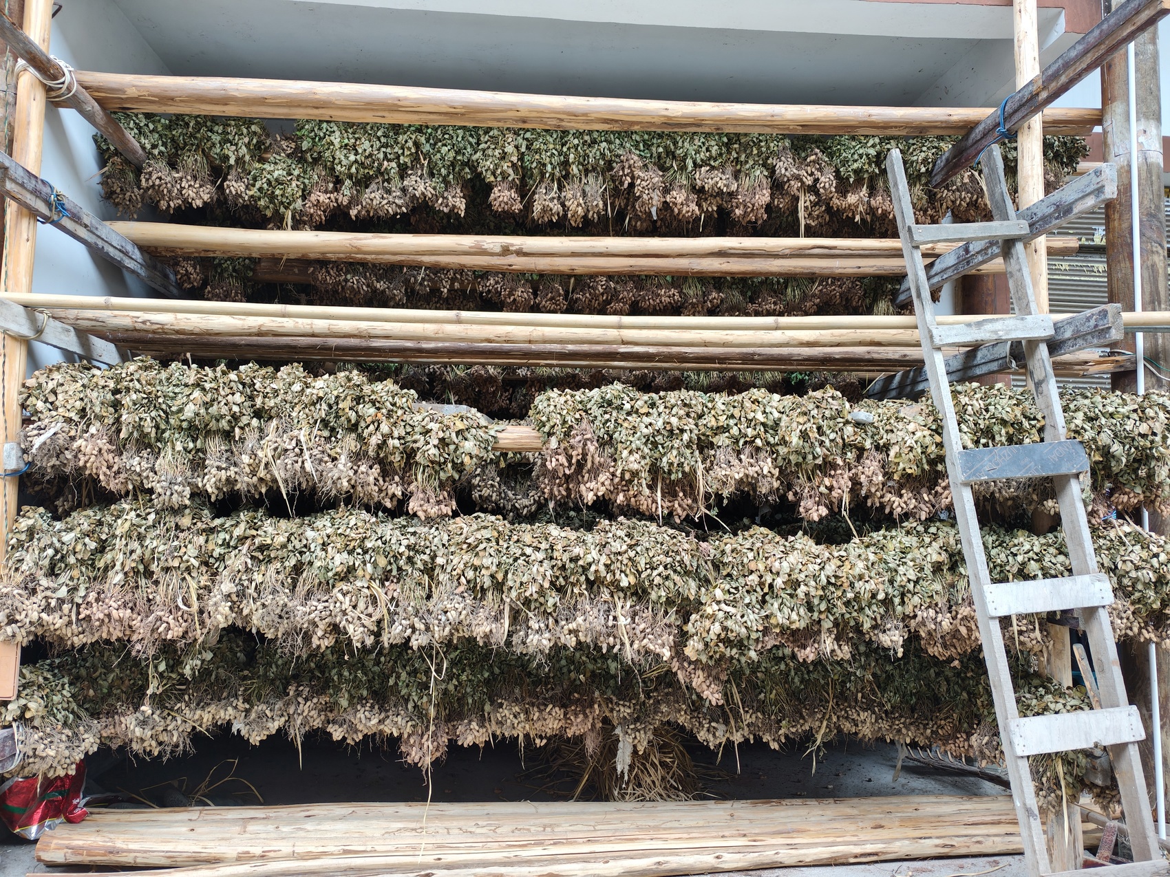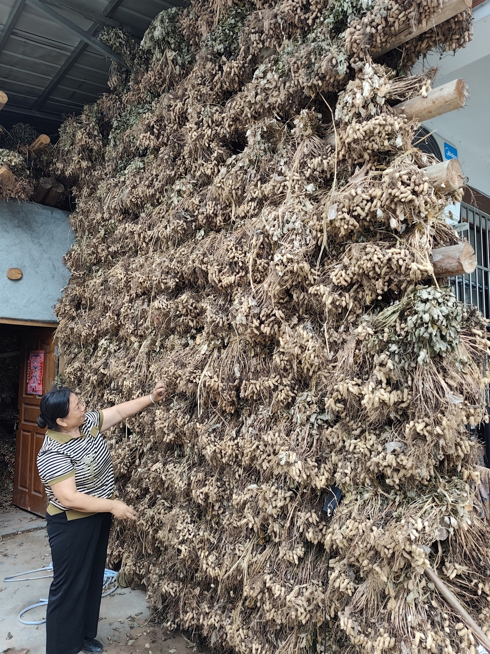 芦山县农业农村局经济作物站站长敖志华介绍,芦山县花生种植面积约有1000亩,均集中种植在龙门镇。长期以来,农户几乎都是将收获的花生搭上晾架进行阴干,搭建晾架的竹木材料可就地取材、成本不高,一个晾架的高度为3—4米,花生全株收获以后,每三五株捆成一捆,一层层地搭上晾架,从而形成了一个不占地的“立体晒场”。这样的“立体晒场”不仅能阴干花生,还能阴干苞谷和大豆。